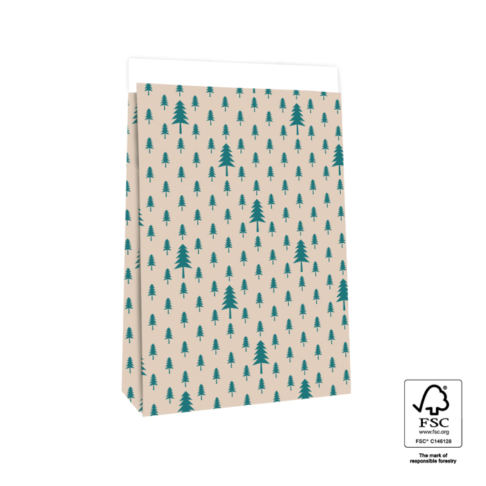 SEO-titel: Blokbodemzakken | X-mas Trees Beige/Jade Green – 27x15x34 cm