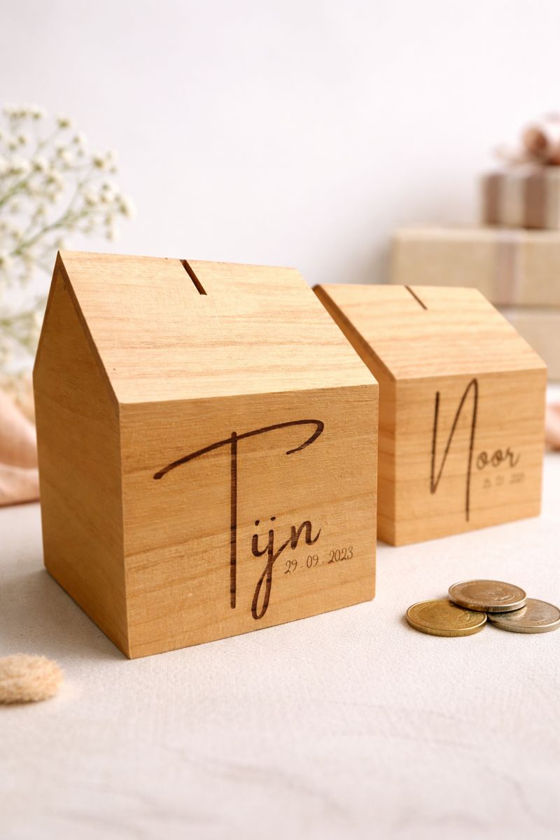 Met deze gepersonaliseerde houten spaarpot huisje geef je meer dan een cadeau: je geeft een symbolisch begin. Voor een nieuw leven, een nieuw thuis of een toekomst vol plannen.