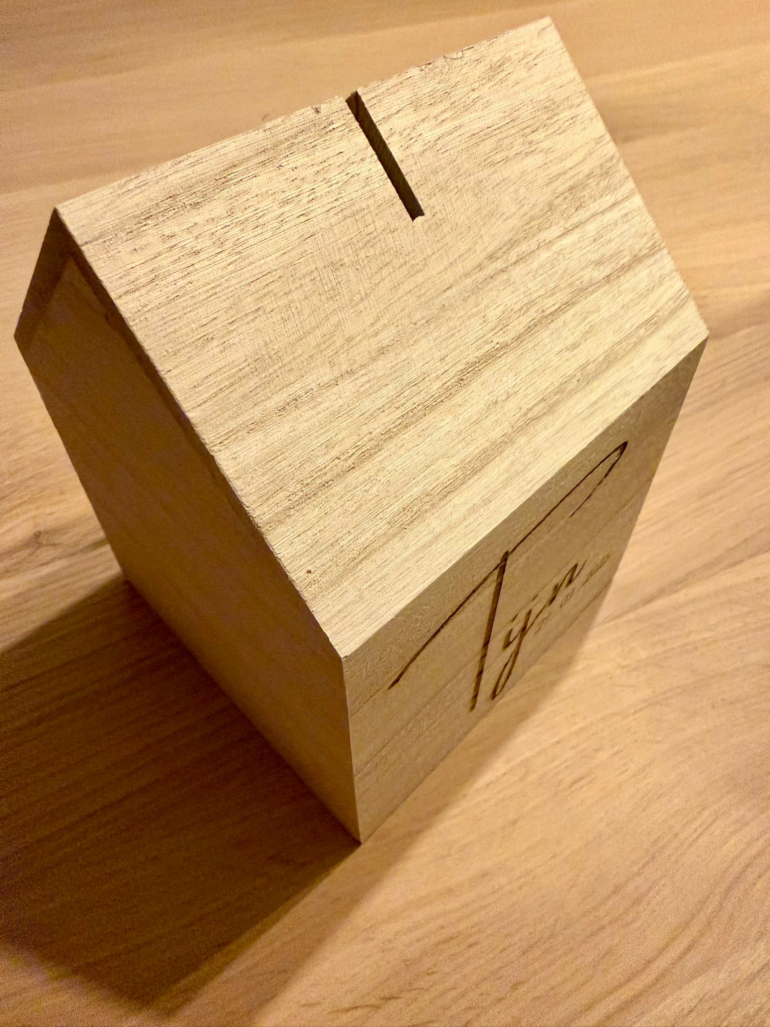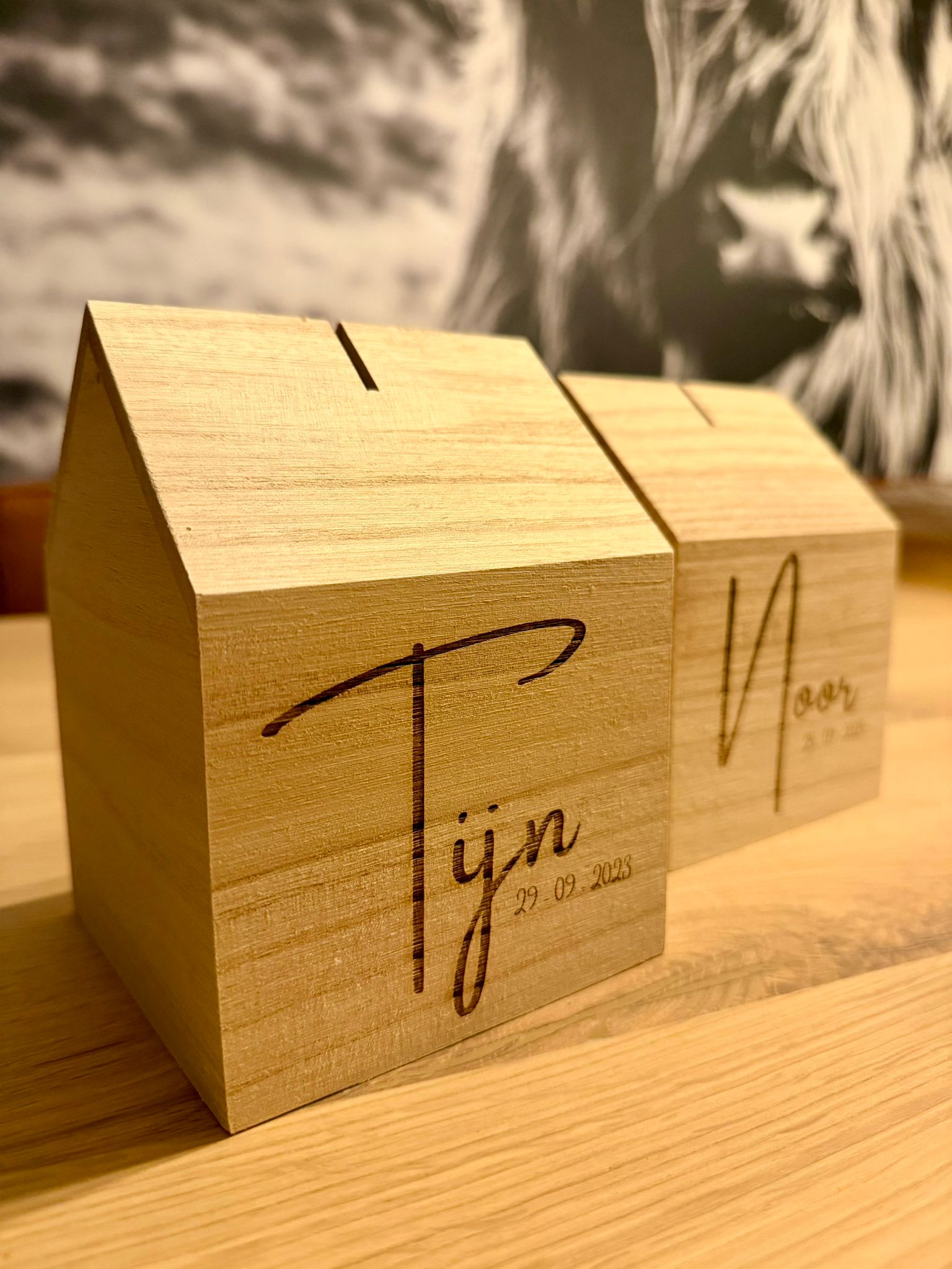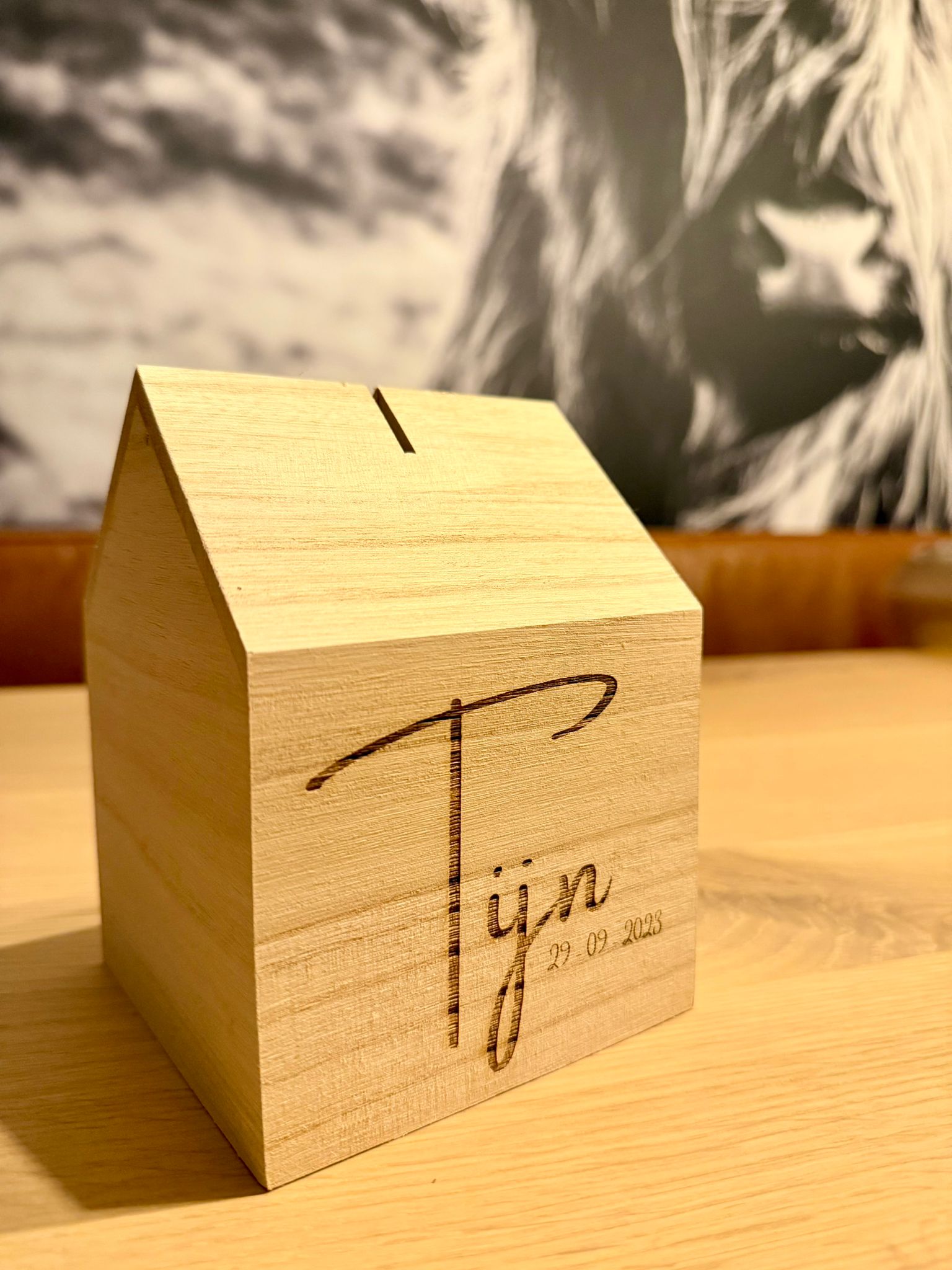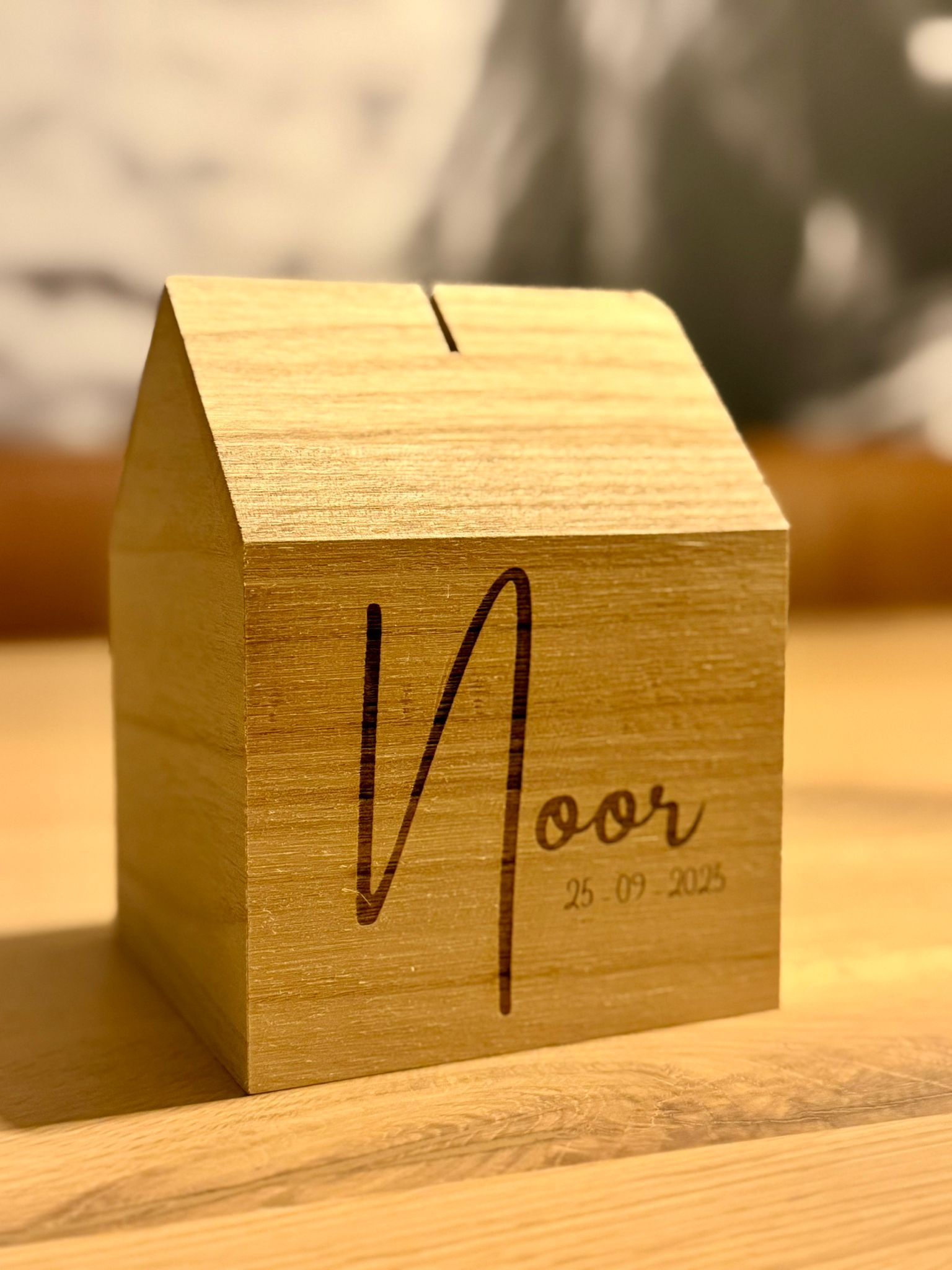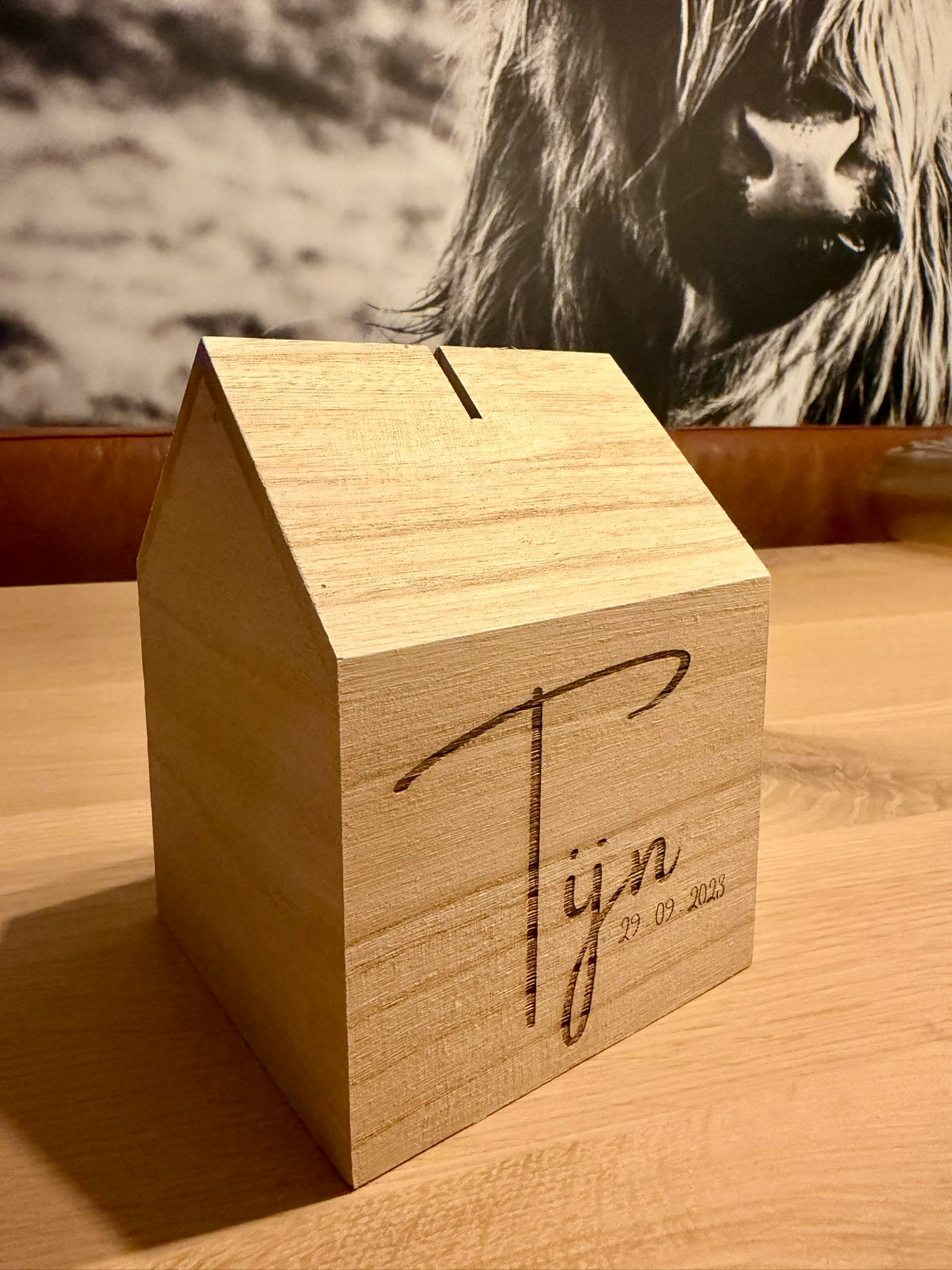 Houten spaarpot huisje – gepersonaliseerd met naam