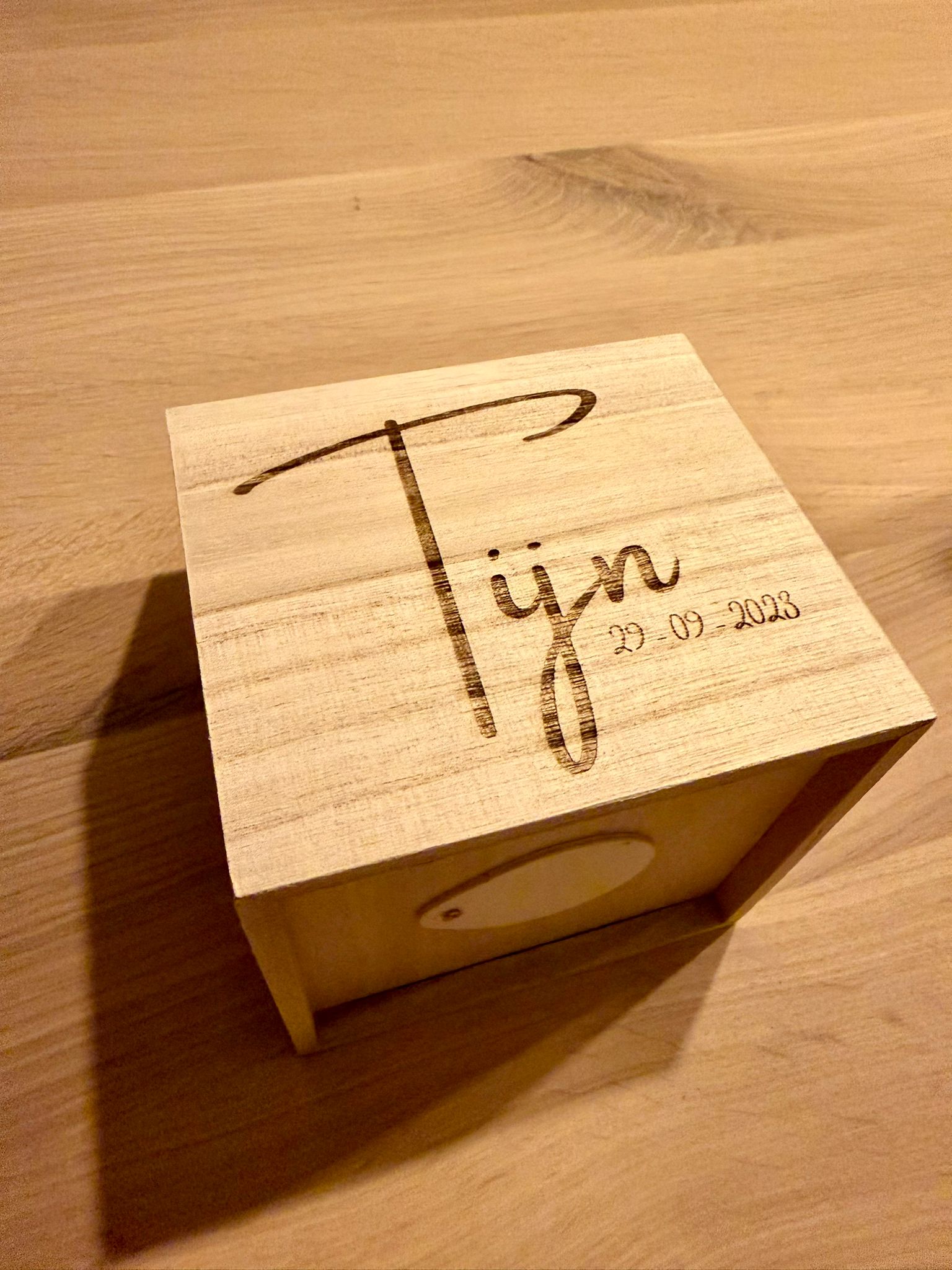 De spaarpot wordt gegraveerd met laser. Denk aan een naam, datum, korte quote of een symbool.