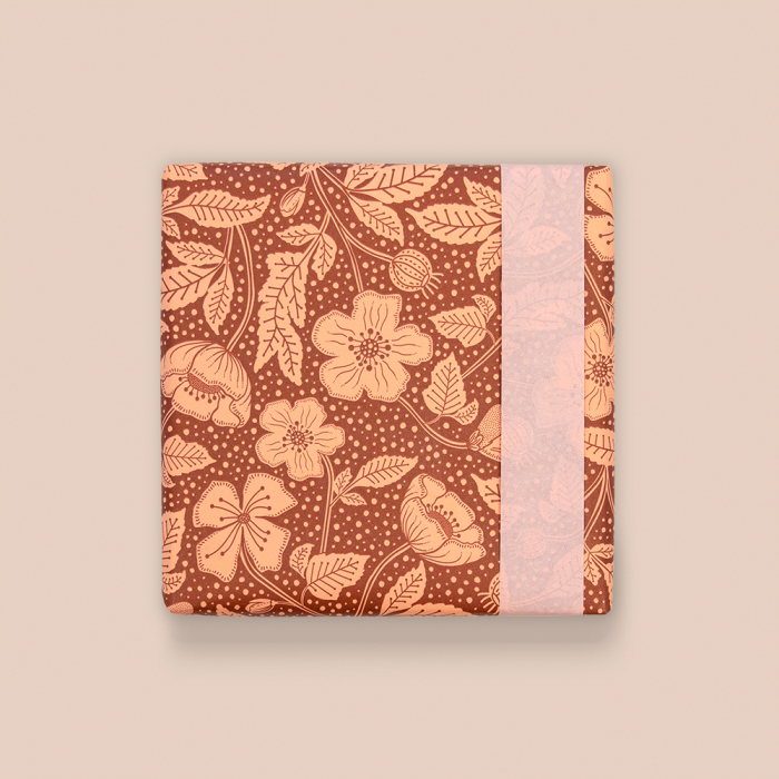 et dessin toont bloemen en bladeren in warme tonale kleuren bruin en oranje. De lichtroze achterzijde geeft een subtiele, elegante finishing touch. Het stevige papier rolt soepel af en is ideaal voor dagelijks gebruik in je winkel of webshop. Perfect voor het inpakken van cadeaupakketten, bloemen of romantische geschenken.