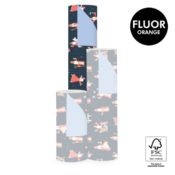 Vier Sinterklaas in stijl met het inpakpapier Sint Acrobaat Night Blue. Dit vrolijke dessin toont Sinterklaas als acrobaat op een diepe donkerblauwe achtergrond met opvallende fluor oranje details. De lichtblauwe binnenzijde zorgt voor een verrassende, speelse twist.