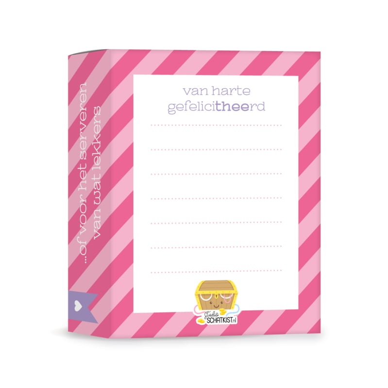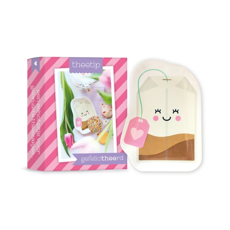 De kartonnen verpakking bevat ruimte voor een persoonlijke tekst, waardoor de theetip meteen een kant-en-klaar cadeautje is. Leuk om te geven bij een verjaardag, geslaagden of gewoon als kleine attentie voor een theeliefhebber.